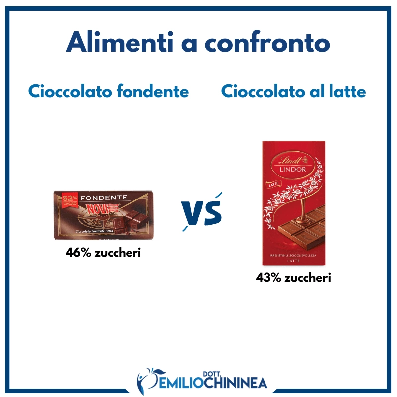 Quello che vedete in foto è il confronto tra un fondente (al 52%) e un cioccolato al latte qualsiasi. La quantità di zucchero è più o meno la stessa.